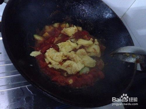 5. 炒西红柿:锅中留少许油,放入葱花爆香,再加入西红柿块,炒至西红柿出汁。